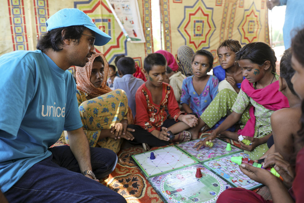 2022年夏、パキスタンを襲った大洪水は、全4州の村々とインフラを押し流し、数百万人の子どもが家族や自宅、安全、そして教育を受ける場を一夜にして失いました。写真はシンド州モヘンジョダロの政府運営キャンプ場にユニセフが設置した「子どもにやさしい空間」で、ユニセフのコミュニケーション担当者が被災した子どもをボードゲームで遊ばせている様子。(パキスタン、2022年9月撮影)