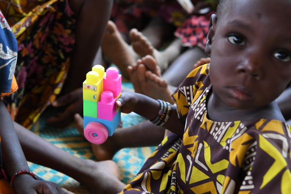 治安悪化により多数の国内避難民が出ているブルキナファソ。ユニセフは「子どもにやさしい空間」を設置し、避難している子どもたちに遊びや学習、ゲームなどを通じて子どもたちに心理社会的サポートをはじめ必要な支援をを提供しています。(ブルキナファソ、2022年5月)