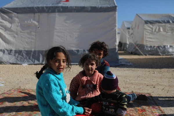 アレッポのアフリーンで、家を失った人たちのための避難所で過ごす、被災した子どもたち。(シリア、2023年2月9日撮影)