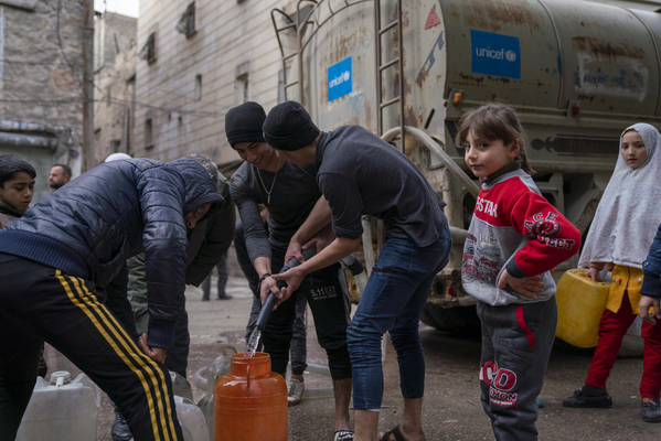 北西部のアレッポで、ユニセフが支援する給水車から安全な水を容器に汲む人たち。(シリア、2023年2月10日撮影)
