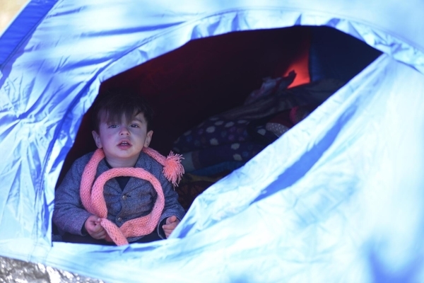カフラマンマラシュの一時避難所のテントの中に座る子ども。(トルコ、2023年2月11日撮影)