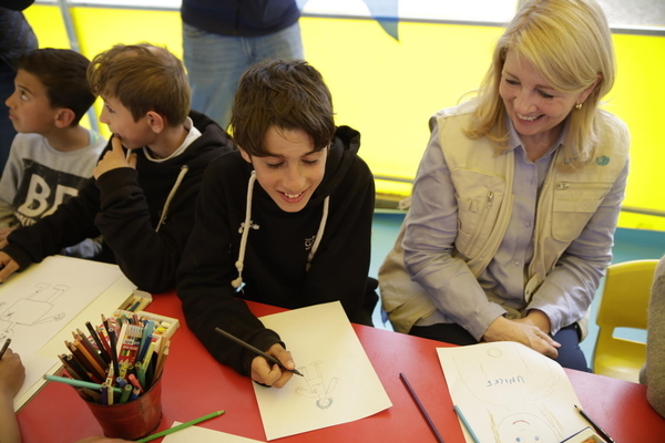 ガジアンテップにあるユニセフの子どもにやさしい空間を訪れるラッセル事務局長。(トルコ、2023年2月27日撮影)