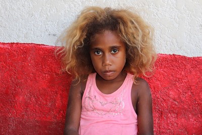 サイクロンにより自宅が破壊され、家族と共に避難所に身を寄せる7歳のマリーさん。「木は揺れて、家の屋根は吹き飛んでいて、とても怖かった」と話す。(バヌアツ、2023年3月6日撮影)