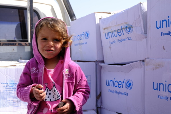 北西部の国内避難民キャンプに届いたユニセフの衛生物資。(シリア、2023年3月1日撮影)