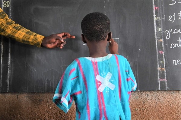 公立小学校で授業を受ける8歳のアバッセさん。以前住んでいた南東部の村が武装勢力に襲われ、家族と逃れた。(ベナン、2022年10月撮影)
