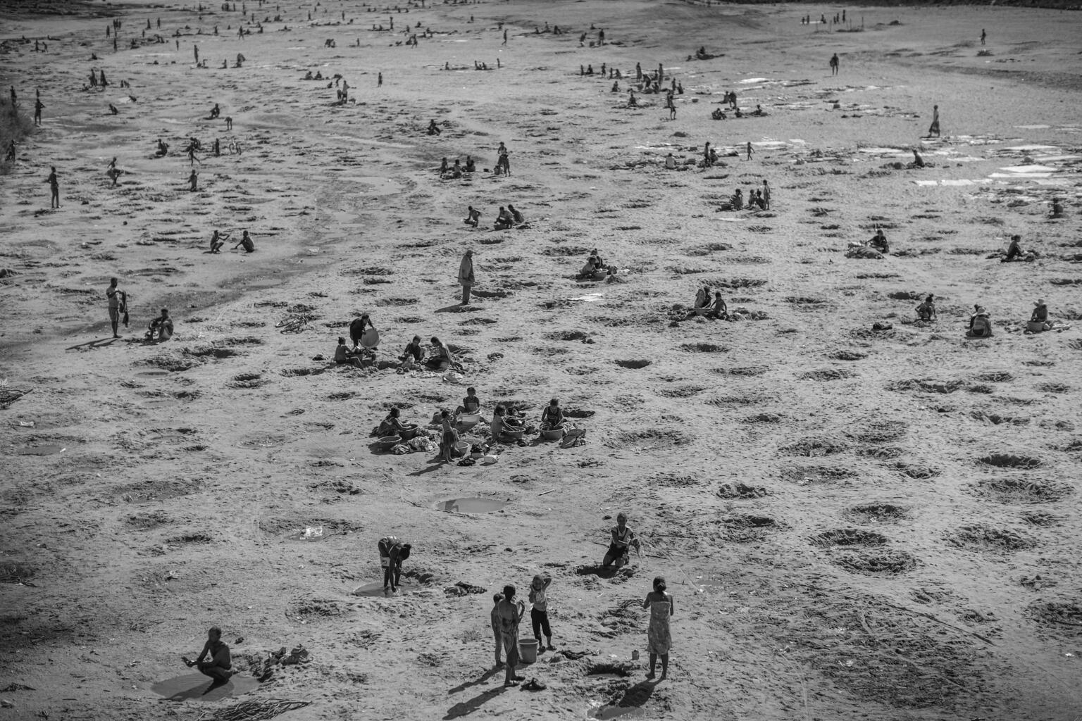 干上がった川の底にかすかに残る水を集める人々。マダガスカル南部のこの地域の人々は農耕と牧畜で生計を立てていますが、安全な水を手に入れるのは非常に困難です。水の値段は給水施設からの距離によって決まり、20リットルあたり0.2米ドル~0.5米ドルほどです。タンクに入れた20リットルの水を頭に載せて、20キロもの距離を運ぶ子どもたちもいます。(マダガスカル、2022年8月9日撮影)