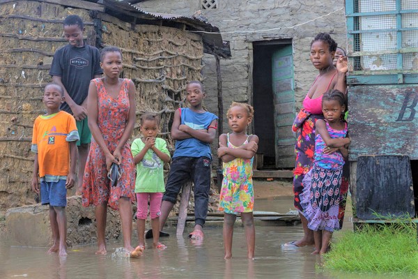 サイクロン「フレディ」により浸水した、ケリマネ近郊の自宅前に立つ家族。母親は、雨による寒さと空腹を訴える子どもたちを避難所へ連れて行くか考えている。(モザンビーク、2023年3月11日撮影)