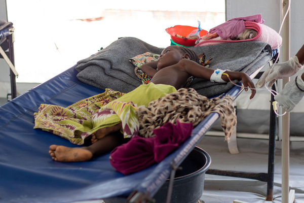 保健センターで、コレラの治療を受ける4歳のバネッサちゃん。(マラウイ、2023年3月7日撮影)