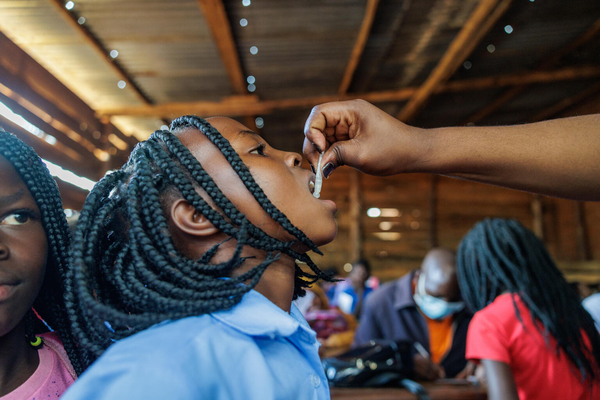 ニアッサ州の小学校で行われたコレラの予防接種キャンペーンで、経口コレラワクチンの投与を受ける女の子。(モザンビーク、2023年2月27日撮影)