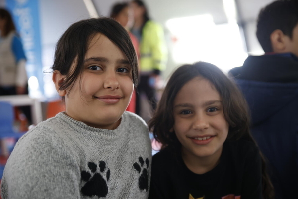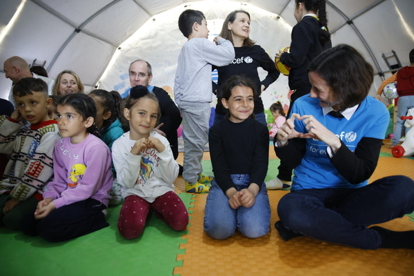 ハタイの一時避難所にあるユニセフの子どもにやさしい空間で、心理社会的支援を受ける子どもたち。(トルコ、2023年3月17日撮影)