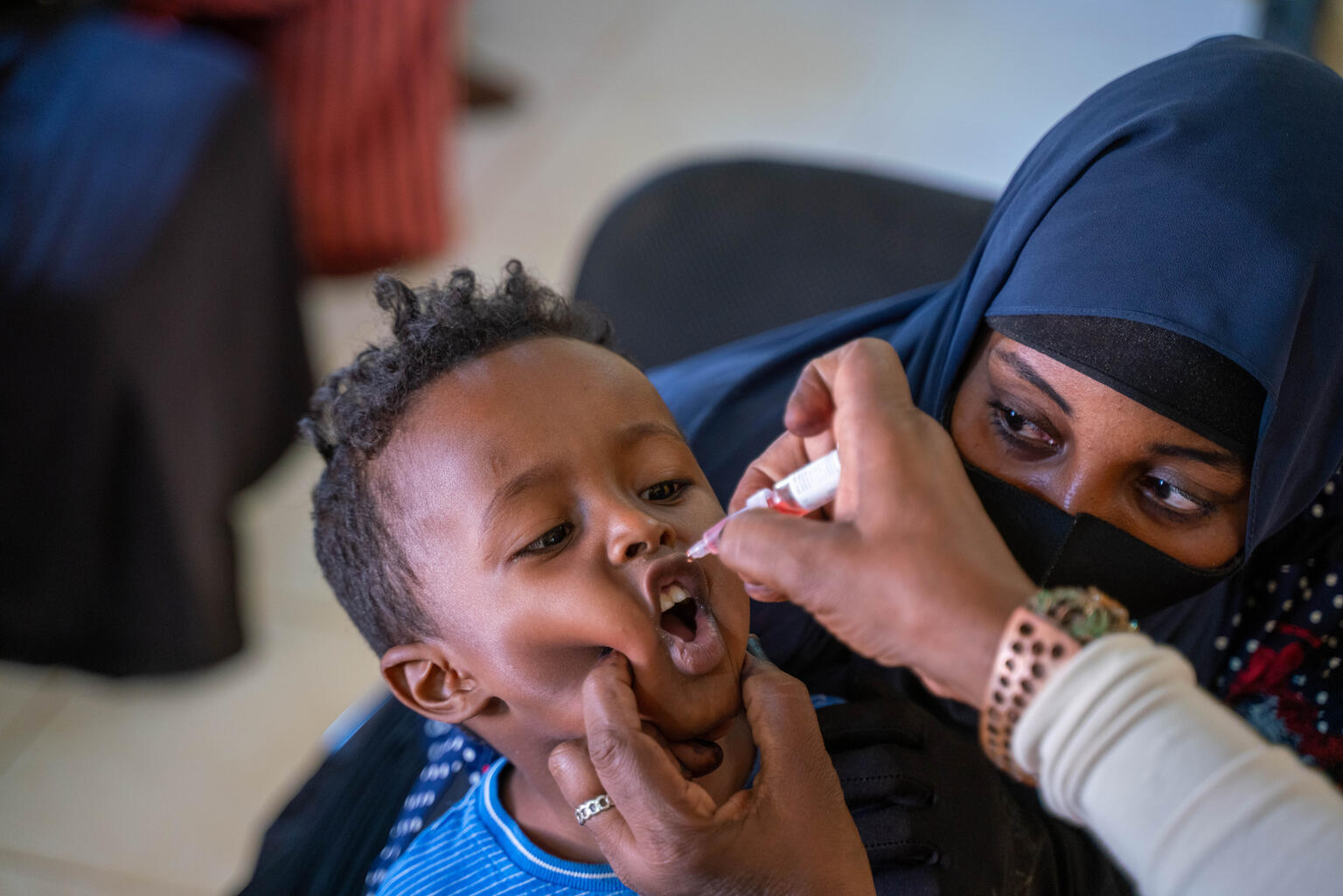ポリオの予防接種を受ける子ども。 スーダンでは2022年12月にポリオの集団感染が確認され、ユニセフなどが支援する予防接種キャンペーンが全国で展開されている(スーダン、2023年3月)