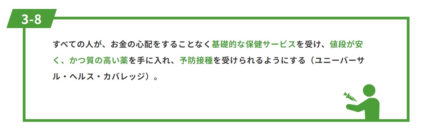 予防接種は最も費用対効果が高い保健介入の一つであり、すべての人が予防接種を受けられるようにすることは、SDGsの目標3のターゲット(3-8)にも含まれています。