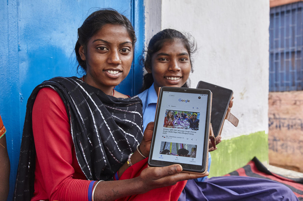 ビハール州のパトナにある学校で、タブレット端末を活用して学習するソナムさんとカージャルさん。(インド、2023年3月17日撮影)