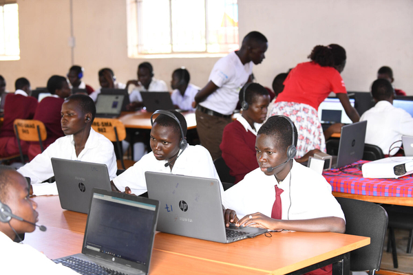 アジュマニ県の女子中学校で、パソコンを使い生物のオンライン授業を受ける女の子たち。(ウガンダ、2023年3月20日撮影)