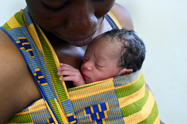 北部のコロゴにある病院で、早産で生まれた赤ちゃんを抱く母親。低体重で生まれた新生児の生存率向上につながるカンガルー・マザー・ケア(KMC)を実践し、生まれたばかりの赤ちゃんを温めている。(コートジボワール、2022年3月撮影)