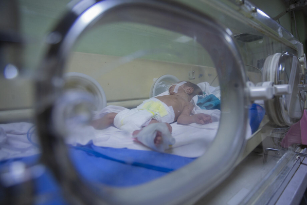 首都バグダッドの病院で、早産で生まれたため人工呼吸器をつけ保育器の中で治療を受ける生後28日のモハメドちゃん。(イラク、2023年4月30日撮影)