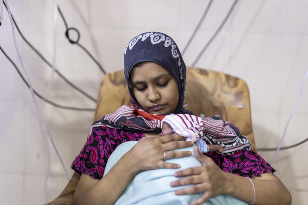 テランガナ州にある病院の新生児集中治療室(NICU)で、早産により低体重で生まれた赤ちゃんを抱く母親。(インド、2022年7月撮影)