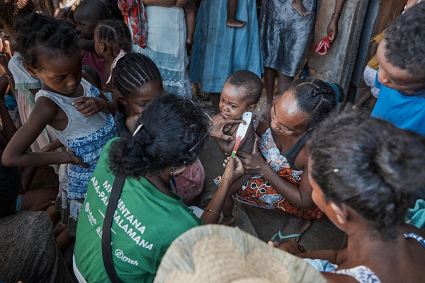 アツィモ・アンドレファナ県の遠隔地にある村を訪れたユニセフが支援する移動式栄養クリニックで、上腕計測メジャーを使った栄養検査を受け、重度の栄養不良と診断された2歳のミチンジュちゃん。(マダガスカル、2023年3月撮影)