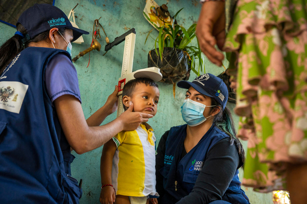 ユニセフが支援する移動式保健・栄養チームのスタッフに身長を測ってもらう2歳のハイメちゃん。移動式保健・栄養チームは遠隔地の村を訪れ、子どもたちの栄養状態の確認や予防接種のサービスを提供している。(グアテマラ、2023年1月撮影)