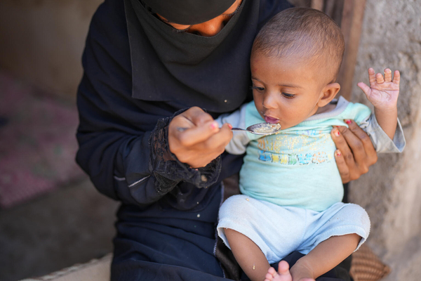 ラヒジュ県にある自宅で、母親にご飯を食べさせてもらう生後7カ月のサナドちゃん。重度の急性栄養不良のため2カ月間治療を受け、今は回復傾向にある。(イエメン、2023年5月撮影)