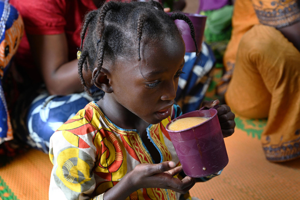 栄養価のある食事の作り方を学んだ後に、作ったご飯を受け取った女の子。(カメルーン、2023年6月14日撮影)