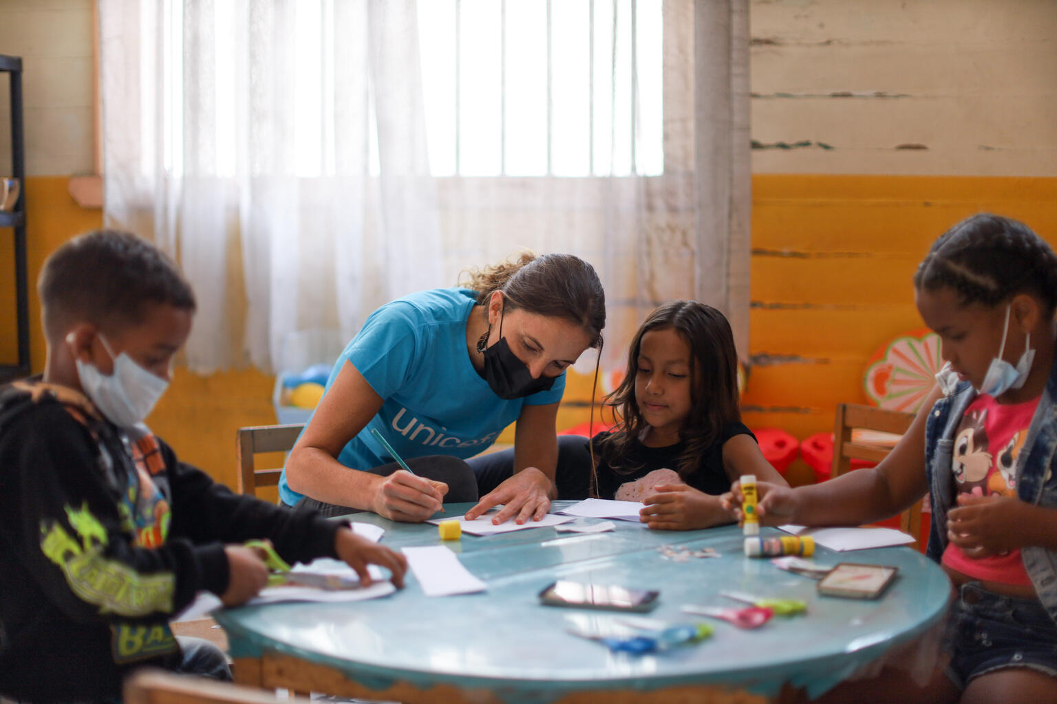 イキケにあるユニセフが支援する移民家族のためのセンターで、ベネズエラから来た子どもたちへの支援活動を行う、ユニセフのスタッフ(チリ、2022年4月25日撮影)