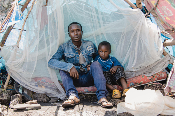 北キブ州の難民キャンプに逃れた親子。父親はコレラに感染したが、ユニセフの治療を受け回復した。(コンゴ民主共和国、2023年4月3日撮影)