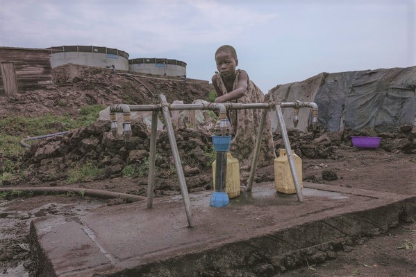 ゴマの西部にあるBulengoキャンプで、ユニセフによって設置された水道から水を汲む子ども。(コンゴ民主共和国、2023年7月21日撮影)