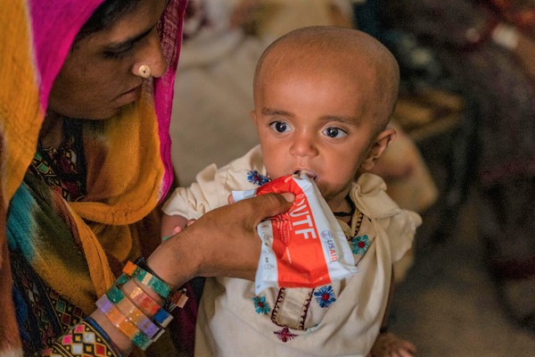 すぐに食べられる栄養治療食(RUTF)を母親に食べさせてもらう重度の急性栄養不良の1歳のラシードちゃん。(パキスタン、2023年6月撮影)