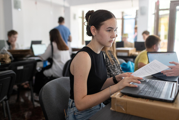 ユニセフが支援する若者のウクライナ難民のためのITの授業に参加する13歳のアーニャさん。(ルーマニア、2023年7月撮影)