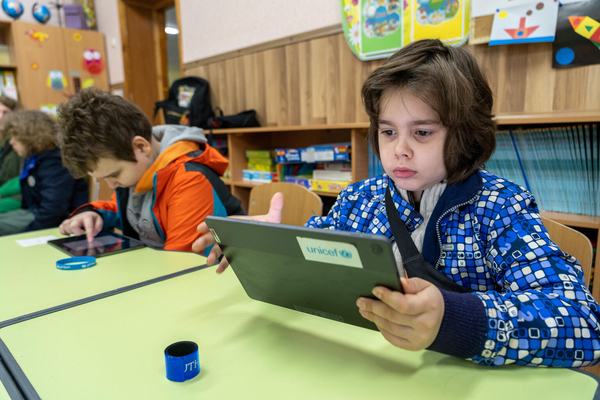 ヘルソン州の学校で、タブレット端末を使用し、授業を受ける8歳のフリブさん。今までは2人の兄弟と1台のスマートフォンを共有して勉強していたが、ユニセフの支援により1台のタブレット端末を受け取ることができた。(ウクライナ、2023年4月撮影)