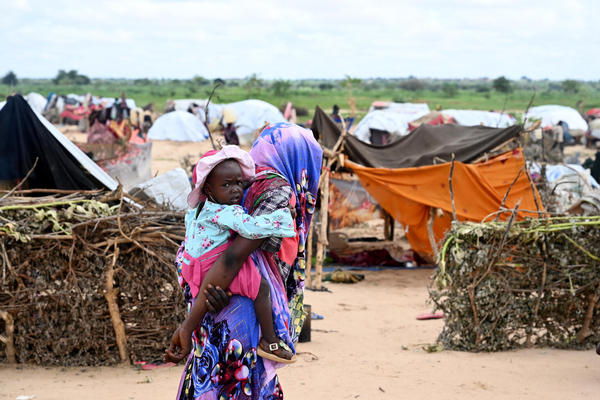 スーダンとの国境に近い、チャドのアドレにある避難所で暮らす親子。(チャド、2023年8月10日撮影)
