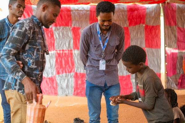 ワドメダニの国内避難民キャンプで、石けんを使った正しい手洗いを学ぶ子ども。(スーダン、2023年8月15日撮影)