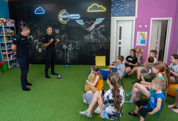 ヘルソン州のスピルノ・チャイルド・スポットで、地雷についての授業を受ける子どもたち。(ウクライナ、2023年7月21日撮影)