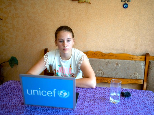 新学期が始まる中、ユニセフから受け取ったパソコンで、もう1年オンライン学習を受ける準備をする12歳のビクトリアさん。「戦争が始まってから1年半、同級生に会っていないです」と話す。(ウクライナ、2023年8月6日撮影)
