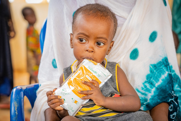 バワ国内避難民キャンプの移動式保健クリニックで、すぐに食べられる栄養治療食を口にする1歳のアブデルラハマンちゃん。クリニックでは、国内避難民のために予防接種や栄養検査、妊産婦検診、マラリア検査などの支援を提供している。(マリ、2023年8月29日撮影)