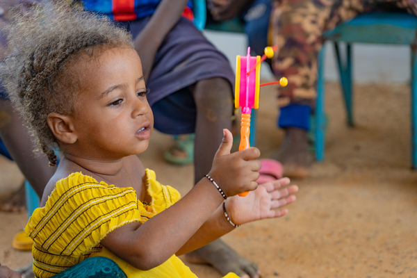 バワ国内避難民キャンプ内にある子どもにやさしい空間で遊ぶ子ども。紛争の影響を受け、避難した子どもたちに心のケアを提供している。(マリ、2023年8月29日撮影)