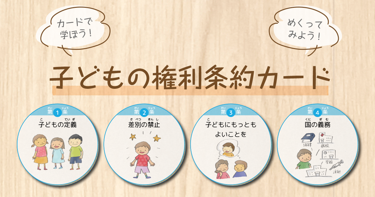 子どもの権利条約第1条~第40条が40枚のカードに。クリックして裏返すと、裏に書いている抄訳を読むことができます。 |
