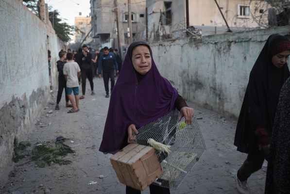 南部のラファにある自宅が空爆を受け、泣きながら避難する女の子。(ガザ地区、2023年12月6日撮影)
