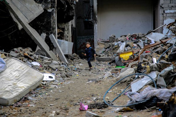 爆撃により破壊された自宅の前を走る5歳のモハメドちゃん。(ガザ地区、2023年12月7日撮影)