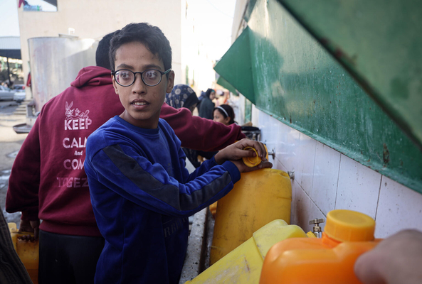 ラファの避難所にある水道から、タンクに水を汲む男の子。(ガザ地区、2023年12月6日撮影)