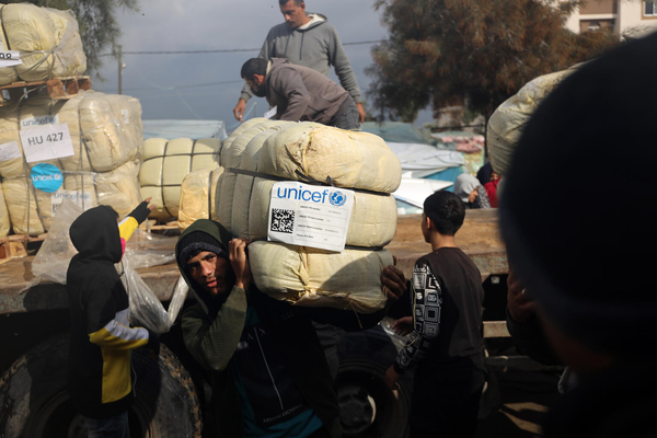 ・この数週間で、ユニセフのトラック35台がガザに入り、11万人分の水容器、15万人分の医薬品医療キット、3万人分の医療消耗品、7,200人分の衛生キット、2,450人分の栄養不良の子どものための栄養治療食(RUTF)、2,000人分の子ども用防寒着、7,500人分の乳幼児用防寒着、5,000人分の毛布を搬入しました。