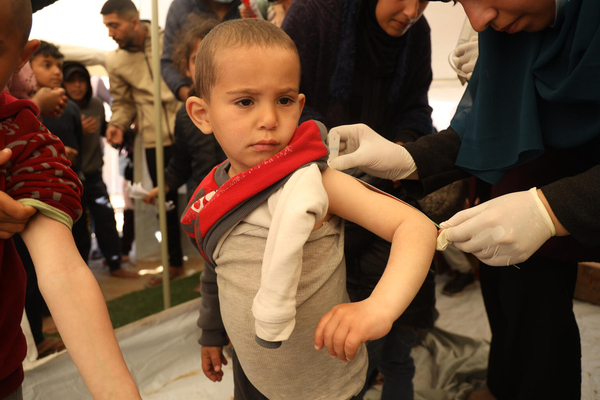 南部ラファにあるユニセフ支援の小児科のテントで、上腕計測メジャーで栄養状態をチェックされている3歳のアクラムちゃん。(ガザ地区、2024年2月15日撮影)