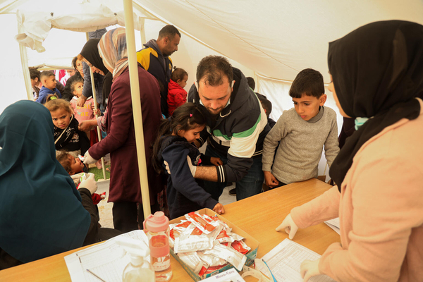 南部ラファにあるユニセフ支援の小児科のテントでは、子どもたちに上腕計測メジャーを使った栄養状態の確認や、すぐに食べられる栄養治療食(RUTF)を用いた治療などの栄養支援を行なっている。(ガザ地区、2024年2月15日撮影)