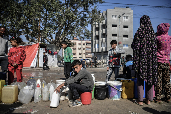 ラファで、きれいな水を汲むために列に並んで待つ11歳のムハンマドさん。(ガザ地区、2024年2月25日撮影)
