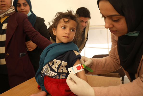 上腕計測メジャーで、栄養不良を意味する「赤」が示された2歳のリーンちゃん。戦闘激化前は、適切な薬の治療や理学療法を受けて健康状態が改善しつつあったが、今は体重も激減し、深刻な急性栄養不良に直面している。(ガザ地区、2024年2月15日撮影)