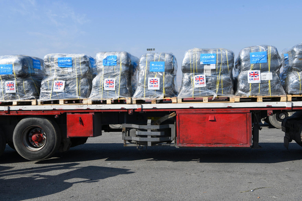 避難する家族や子どもたちのために、ヨルダンからトラックで届いたユニセフの毛布、テント、マットなどの支援物資。(ガザ地区、2024年2月23日撮影)