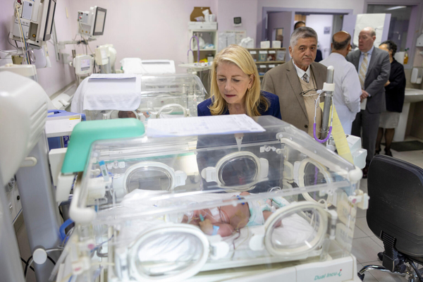 東エルサレムの病院を訪れ、保育器の中にいる赤ちゃんを見守るユニセフ事務局長のキャサリン・ラッセル。(パレスチナ、2024年4月15日撮影)