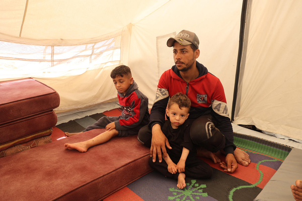 ラファにある避難所のテントの中で、父親と過ごす7歳のアミールさん(左)と2歳の従弟。母親はガザ北部にいるため離れ離れになっている。アミールさんは学校に避難したときに右脚を負傷し、あと数回の手術が必要な状態である。(ガザ地区、2024年4月14日撮影)