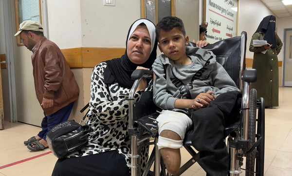 ハンユニスの病院で、脚を切断し車いすに座る男の子。(ガザ地区、2024年4月8日撮影)